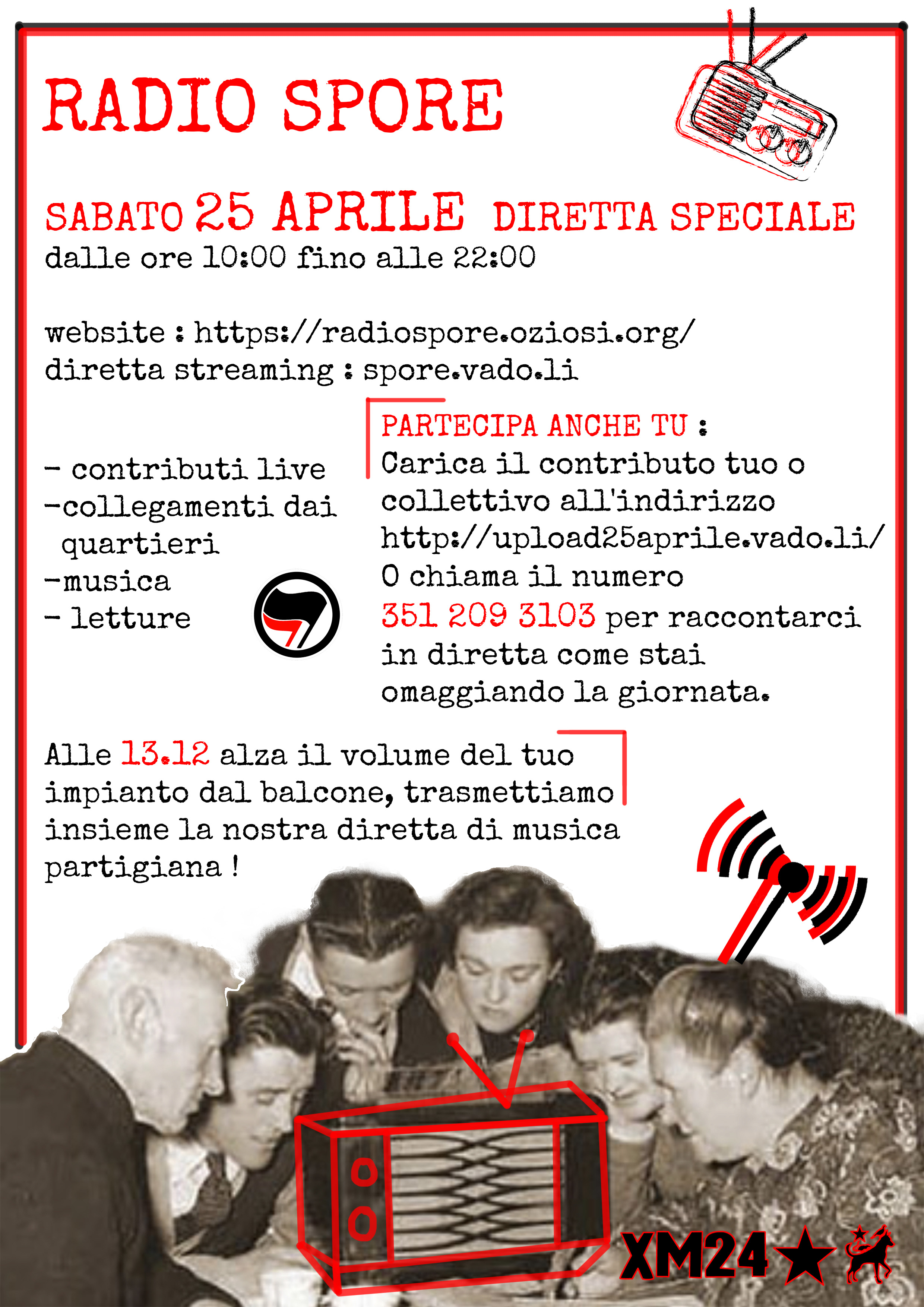 L’invito è quello di connettersi a Radio Spore dalle ore 10:00 del mattino fino alle 22:00 per la diretta speciale con contributi live, collegamenti telefonici e aggiornamenti dai quartieri. Ma soprattutto, per diffondere musica con impianti stereo casalinghi dai propri balconi, l’appuntamento è alle 13.12, in contemporanea all’esposizione di bandiere e striscioni, per far risuonare in ogni strada una playlist di musica partigiana fino alle 13.30.